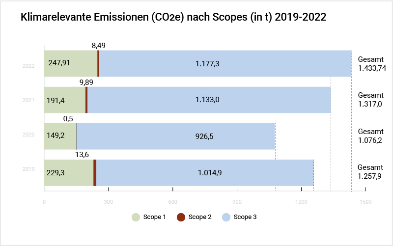 Scope 3 (indirecte emissies) heeft verreweg de grootste invloed in alle jaren, met ongeveer 80%. Scope 2 heeft daarentegen bijna geen invloed op klimaatrelevante emissies (≤1%). Dit komt door het gebruik van 100% groene stroom (exclusief buitenopslag). Scope 1 genereert 14-18% van de emissies. Dit omvat warmteopwekking, brandstoffen en airconditioningtechnologie.In de loop van de 4 jaar is het Corona jaar 2020 duidelijk zichtbaar - in lagere emissies, voornamelijk door zeer beperkte mobiliteit. Vanaf 2021 is dan de groei van de omzet zichtbaar (meer materiaalverbruik) en de teruggewonnen mogelijkheid van werken op kantoor (woon-werkverkeer) en zakenreizen.