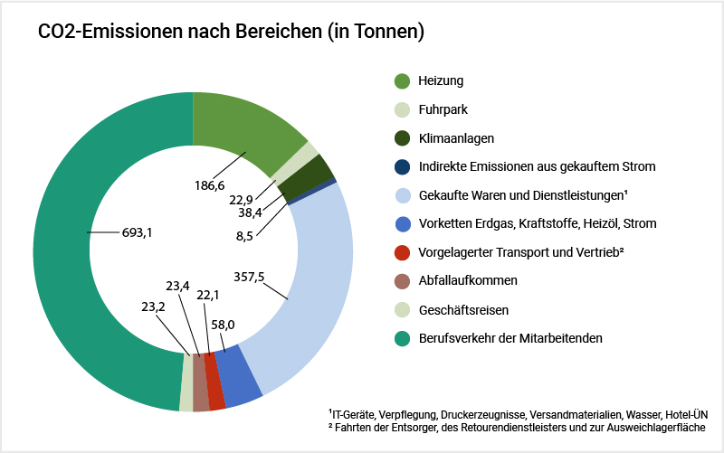 Het taartdiagram toont de verdeling van de in totaal 1.434 ton CO2e over de verschillende gebieden. Bijna de helft (48%) van de geregistreerde uitstoot is te wijten aan het woon-werkverkeer van werknemers - hoewel mobiel werken een officieel en populair onderdeel is van het werkende leven in onze administratie, laat het groeiende personeelsbestand zich nog steeds voelen. De vestigingen en de logistiek kunnen het over het algemeen niet stellen zonder werknemers op locatie. Daarom blijven we ons richten op het verminderen van de indirecte uitstoot door het reizen van medewerkers. Overigens wordt het woon-werkverkeer jaarlijks vastgesteld door middel van een bedrijfsbrede enquête. De inkoop van verbruiksartikelen neemt met 24% het op één na grootste deel voor zijn rekening. Hieronder vallen IT-apparatuur, printerpapier en verzendmaterialen. Deze laatste zijn goed voor ongeveer 78% van de uitstoot.