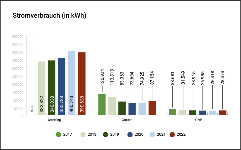 De belangrijkste energiebron voor alle locaties is elektriciteit, die we sinds januari 2019 voor 100% inkopen bij gecertificeerde groene stroom en sinds december 2021 zelf produceren. Het hogere elektriciteitsverbruik sinds 2021 is enerzijds te verklaren door de logistiek, die nu langer in bedrijf is door de grote groei. Anderzijds is de shuttle-uitbreiding gebouwd in 2021/22 (bouw elektriciteit). Andere energiebronnen zijn aardgas en stookolie voor de verwarming van de locaties en brandstof voor de voertuigen. Het brandstofverbruik daalde al in 2022 door de geleidelijke overschakeling op e-voertuigen sinds 12/2021. Voor de vestigingen was 2022 het eerste jaar zonder sluitingstijden en met evenementen na de Corona pandemie.