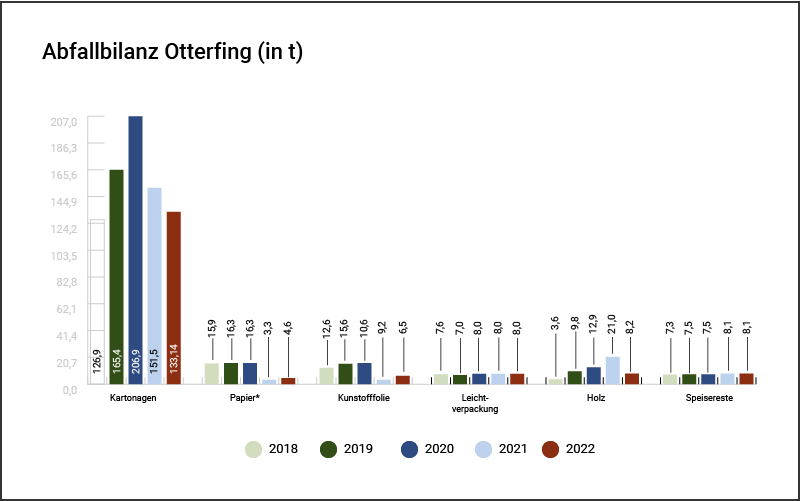 De afvalfracties worden gedomineerd door karton, papier, afvalhout en plastic folie. De meeste van deze fracties ontstaan op de logistieke locatie in Otterfing, waar niet alleen de expeditieafdeling is gevestigd, maar ook de centrale goederenontvangstafdeling voor nieuwe goederen. Door de exploitatie van onze kantine hopen organisch afval en etensresten zich hier op. Door de economische groei en de daaruit voortvloeiende toename van inkomende en uitgaande goederen is de hoeveelheid afval in Otterfing de afgelopen jaren jaarlijks toegenomen.