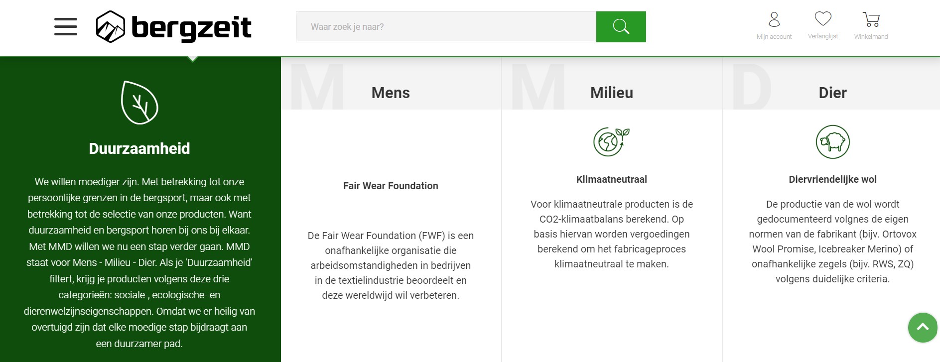 Bij Bergzeit hebben we onze duurzame kenmerken vooral gedefinieerd in termen van officiële labels en certificaten. Deze kunnen in drie categorieën verdeeld worden: mensen, milieu en dieren. De menselijke categorie kijkt naar sociale factoren in het fabricageproces, zoals de arbeidsomstandigheden waaronder de producten gemaakt werden. In de milieucategorie wordt rekening gehouden met alle ecologische factoren die een rol spelen bij de productie. De laatste categorie, dier, vat alle factoren in het productieproces samen waarbij dieren betrokken zijn, zoals het winnen van wol voor de productie van een trui.